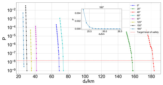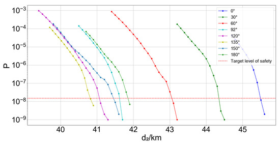(1) According to , is mainly related to the projection angle , consider . When , the projection angle of takes the value of 0, then the leading aircraft moves in the same direction as the trailing aircraft, similar to flying along the trajectory. When < 37° or > 37°, with the trajectory angle far away from 37°, the projection angle gradually increases, and the corresponding collision risk is getting smaller and smaller when the trailing aircraft is at the same distance from the intersection, as shown in Figure 11 below. That is, when the leading aircraft is 10 km away from the intersection, the safe separation of the trailing aircraft from the intersection also decreases gradually, and the specific results are shown in Table 5.