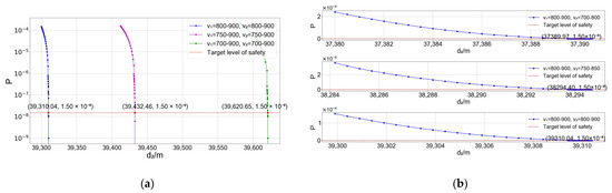 Building on Equation (4), we can derive the probability density function of the distance of the trailing aircraft from the intersection when the leading aircraft is at the intersection. The key aspect of the uniform distribution is the determination of its endpoint values. Our approach involves two steps: We first examine the impact of speed variability on collision risk. This is done by simulating the movement safety of the aircraft at the intersection, assuming both aircraft follow the same uniform distribution. The results of this simulation are illustrated in Figure 14a. Next, we keep the speed distribution of the leading aircraft constant and simulate the collision risk by varying the speed distributions of the trailing aircraft. This step is aimed at understanding the effects of speed differences between the two aircraft. The findings from this analysis are depicted in Figure 14b.