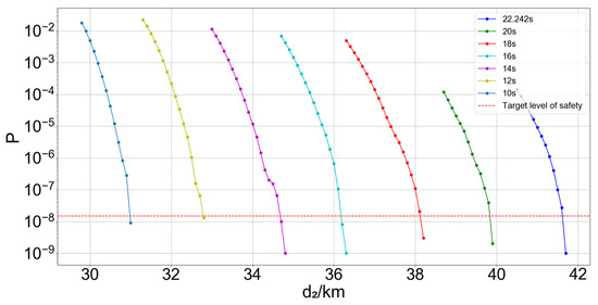 The safe separation discussed above is predicated on a conservative estimate of human-operated adjustment time. However, in real-world operations, the combined duration of the controller’s monitoring, decision-making, and communication; the pilot’s response and execution of instructions; and the aircraft’s maneuvering is likely to be quicker. To illustrate this, Figure 15 presents simulations of collision risk under various scenarios with differing overall human-operated adjustment times. It is evident that, as the total time for human-operated adjustment decreases, both the risk of collision between the two aircraft and the required safe separation distance of the trailing aircraft from the intersection also diminish, as detailed in Table 8. These findings underscore the importance of the controller’s and pilot’s proficiency in emergency situations, as well as the aircraft’s maneuverability in ensuring the safety of airway operations.