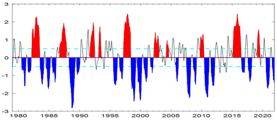 Niño 3.4 index record, 1979−2022. The red represents the warm phase and the blue represents the cold phase. The dashed line in light cyan is the threshold of ±0.5 °C.
