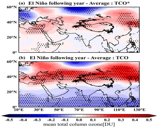 It can be seen from Figure 3a that the phenomenon of the ozone valley in the TP region in the following year of EN is weakened. The strongest effect was found in northeast China at 0.21DU. It should be noted that the change in TCO* values here represents the difference in the shape of the ozone valley between the two periods, encompassing the effect of EN on the ozone across the entire latitude circle. Therefore, assessing the specific effects of EN events also requires consideration of TCO variations (Figure 3b), that is, the difference between the total ozone column content without zonal deviation and the climate average. The change in TCO can better measure the influence of EN on the local ozone content.