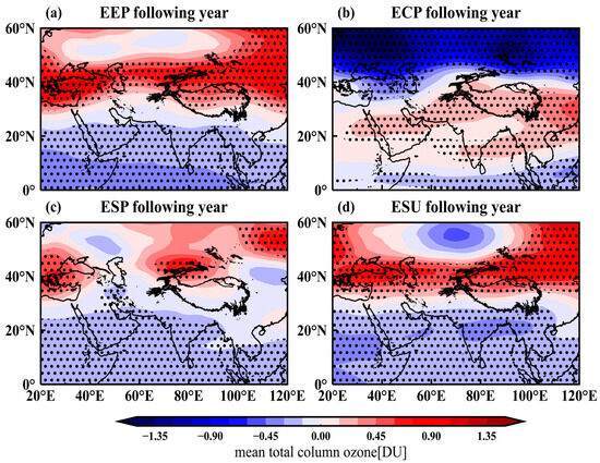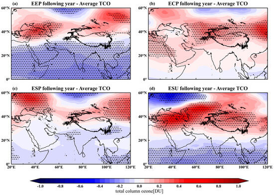 Various types of EN events exert distinct effects on TCO changes over the TP. As is shown in Figure 3, EP-type EN events (Figure 4a) align with the overall difference in intensity and spatial distribution, with negative anomalies in the southern part of the TP and positive anomalies in the northern part. The range of negative anomalies in the low latitudes extends northward to 30° N, and the weak negative values in the Mediterranean region disappear. The intensity of CP-type EN events (Figure 4b) is generally weak, with a distribution pattern of TCO anomalies distinctive from the overall EN. Influenced by CP-type EN events, TCO in the summer of the following year presents a weak positive anomaly in the region near the Tibetan high pressure, where the high value is still around 40° N of approximately 0.2 DU. The positive anomalies at low latitudes near the equator and the negative anomalies near 60° N are weak and insignificant. Temporarily, the negative anomalies of TCO at low latitudes caused by SP-type EN events (Figure 4c) are weak and not significant. The mid-latitude anomaly is similar to the overall EN. The SU-type (Figure 4d) EN event has the strongest influence, and its TCO positive anomaly center is located near the Caspian Sea, with a value of 0.4 DU. There is a strong negative anomaly from southwest Russia to Eastern Europe, with a value of −0.8 DU.