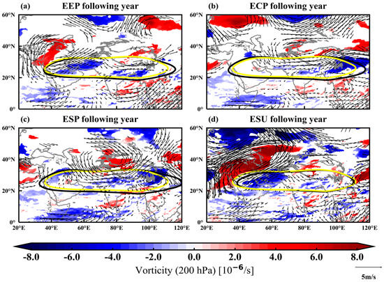 Abnormal distribution of wind fields at the 200 hPa altitude of different types of EN ((a), EP; (b), CP; (c), SP; (d), SU) in the summer of the following year through a 95% confidence test; unit: 10−6/s. The black line represents the characteristic line of the SAH in the summer of the following year of EN, and the yellow line represents the characteristic line of the SAH in the average climatic state.