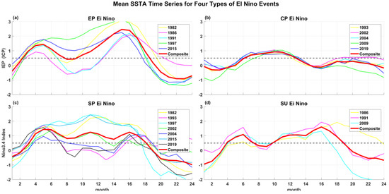 SST indices corresponding to different types of EN events ((a), EP; (b), CP; (c), SP; (d), SU); unit: °C.