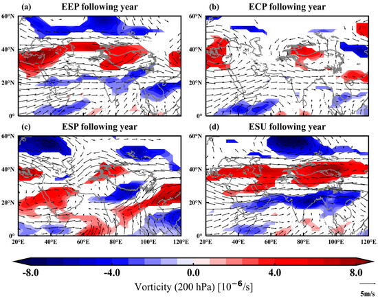 Under the influence of different types of EN, the positive (negative) abnormal regions of vorticity at the height layer of 200 hPa (Figure 5a–d) basically correspond to the positive (negative) abnormal regions of TCO at the UTLS layer of 300–50 hPa (Figure 4a, Figure 4b, Figure 4c and Figure 4d, respectively), indicating that the positive (negative) abnormal vorticity at the layer of 200 hPa causes the increase (decrease) in TCO. In general, the positive vorticity of the upper atmosphere corresponds to the upward motion of the lower atmosphere. The strengthening of the upward movement of the lower atmosphere causes an uplift of the low-concentration ozone in the lower layer to the UTLS layer, resulting in a decrease in TCO. In the area south of 30° N, the circulation field at the 200 hPa level in the summer of the following year for each type of EN event is dominated by negative vorticity anomalies. The vorticity-positive anomaly area is mainly distributed near the 40° N zone, corresponding to the TCO-positive anomaly distribution area. Overall, the distribution of each subgraph south of the 50° N zone is roughly the same. Among them, the positive and negative vorticity anomalies corresponding to CP-type EN (Figure 5b) are weak in intensity, and the corresponding TCO anomalies are also weak, which is related to the weak intensity of CP EN events. Comparatively, north of 50° N, there are differences in the distribution of vorticity anomalies. From west to east near 55° N, in the following year after the EP-type EN event (Figure 5a), there is a positive vorticity anomaly on the southwest side of the Caspian Sea with a central intensity of 5.6 × 10−6/s, a negative anomaly in the north of Kazakhstan and a positive anomaly in the north of Mongolia. After the SP-type EN events (Figure 5c), the negative vorticity anomaly is stronger only in central and southern Russia, which is more easterly than the negative TCO anomaly in the corresponding region (Figure 4c). After the SU-type EN (Figure 5d), a positive vorticity anomaly presents in the northwest of Mongolia and a strong negative vorticity anomaly occurs from south-central Russia to Eastern Europe, with a peak area of 13 × 10−6/s. This corresponds to the high-value area of the negative TCO anomaly in Figure 4d.
