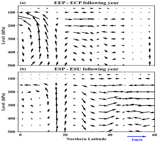 Latitudinal profile of differences in summer wind velocity of the following year between sensitivity experiments of different types of EN in WACCM4 mode ((a), EP-CP; (b), SP-SU). The vertical wind speed is the result of magnification 500 times.