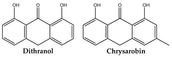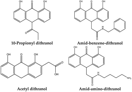 Dithranol itself is derived from chrysarobin [29]; therefore, it is not surprising that some efforts have been directed towards the improvement of the therapeutic index of dithranol by attempting to separate the beneficial effects from the side effects of the drug. This has been realized by the development of new derivates [30,31,32,33], where the staining effect of the drug would be at least theoretically reduced (Figure 3).