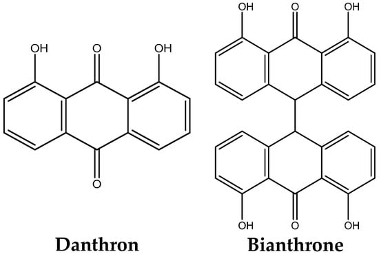 Unpleasant brown–violet coloration [23] and skin irritation due to the formation of dithranol metabolites such as danthron and bianthrone (Figure 2) at the application site formed upon the exposure of dithranol to atmospheric oxygen are the main reasons for its limited usage [24,25,26,27,28]. It cannot be applied to the area of the head and neck, the bends of large joints, or the external genitalia.