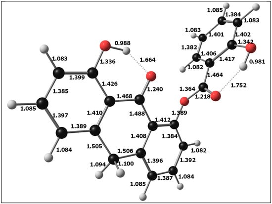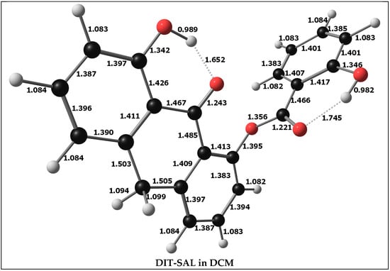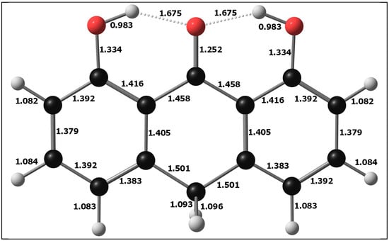 The optimized molecular geometry of DIT-SAL is displayed in Figure 5. The optimized bond lengths were determined using the DFT/B3LYP method with the 6-311++G(d,p) basis set. Naturally, for this new compound, there are no existing data on its structure. We have therefore been restricted to comparing it with dithranol and salicylic acid, which are structurally similar to the two parts of DIT-SAL joined by an ester bond and for which there are data available both from experiments [55] as well as from quantum chemistry computation [56,57,58,59,60,61,62] (Figure 6 and Figure 7); for example, the calculated length of the two hydrogen bonds in dithranol is in very good agreement with the experimental value (1.69 Å versus experimental 1.60 Å). Also, the experimental length of the C=O bond (1.26 Å) is almost identical to the theoretical value (1.25 Å). Good agreement between theoretical and experimental values has also been obtained for salicylic acid, and it can therefore be expected that the theoretical values of the structural parameters for DIT-SAL are also reliable and would be useful for further research and the synthesis of this proposed antipsoriatic drug.