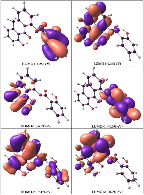 The quantum chemical calculation results in a set of molecular orbitals for the molecule under consideration. These orbitals represent the spatial distribution of electrons within the molecule. Frontier molecular orbitals (FMOs) are of particular interest from a chemical perspective because they play a crucial role in various chemical reactions and the properties of the molecules [63].
