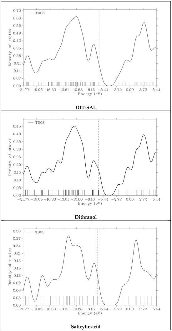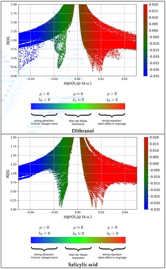 From Figure 16, the importance of two strong intra-molecular hydrogen bonds for both DIT-SAL and dithranol is clearly seen, which stabilize these molecules. What is interesting is that salicylic acid is not stabilized by hydrogen bonding (as can also be seen from the RDG plot), but when it is part of the DIT-SAL molecule, it participates in the formation of a form of hydrogen-bond-mediated stabilization of the proposed drug.