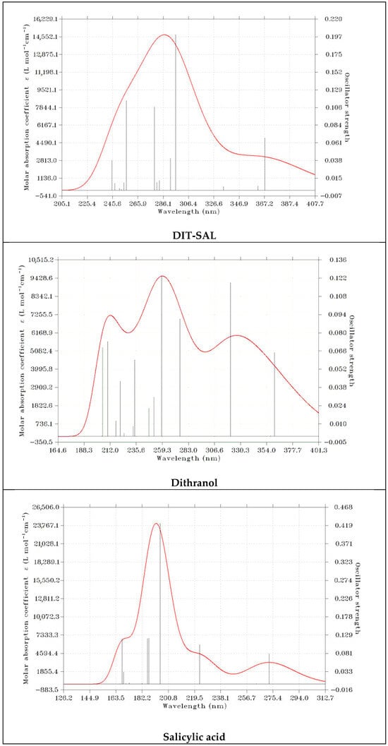 Comparison of UV-VIS spectra of dithranol, salicylic acid, and DIT-SAL calculated using the time-dependent DFT method.