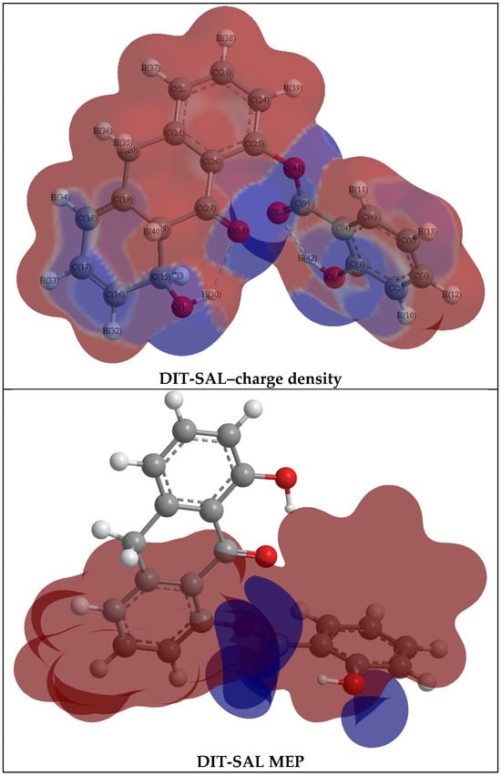 Distribution of total charge density and mean electrostatic potential (MEP) around DIT-SAL molecule. Positive and negative values are depicted in red and blue, respectively.