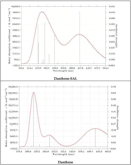 We also found that the possible degradation products of DIT-SAL (in analogy with dithranol oxidation products [59], namely danthron-SAL (Figure 17)) have modified chromophores with a molar absorption coefficient of 4863 L mol−1 c−1 at 417 nm, as compared with danthron’s molar absorption coefficient of 8200 L mol−1 c−1 at 425 nm (Figure 18), which indicates that DIT-SAL’s degradation products would have reduced staining properties, which would possibly be another beneficiary effect of DIT-SAL.