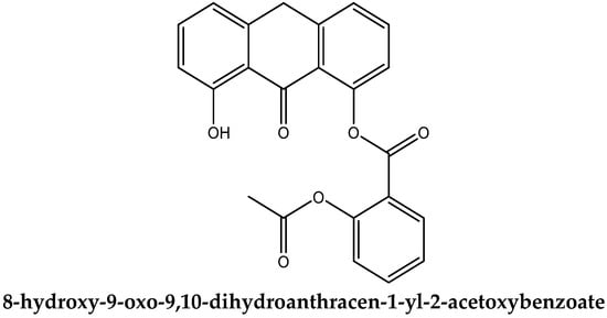 The ability of dithranol to induce keratinocyte differentiation was investigated and correlated with its potency to inhibit the proliferation of keratinocytes [34,35]. To determine the structural requirements for this effect, dithranol and 17 analogues or related anthracenones were examined for their ability to induce the formation of the cornified envelope (a marker of terminal differentiation). Moreover, dithranol, dithranol dimer, and dithranol triacetate exhibited antiproliferative and antirespiratory activity at concentrations required to induce keratinocyte differentiation, suggesting causality between these effects. In addition, cornified envelope formation was observed for several related anthracenones at low concentrations. In general, compounds containing benzoyl substituents, independent of their position in the anthralin nucleus, were more potent than those with benzyl substituents. The basic principles include combined treatment. The idea is to increase the efficiency and decrease the adverse effects of the treatment. This combination of drugs is not accidental but arises from pathogenesis diseases, where it is necessary to suppress both immunopathological inflammation and, on the other hand, a disorder of differentiation and apoptosis. In most therapeutic regimes, dithranol is combined with salicylic acid [17,28]. Salicylic acid is an important ingredient in many skin products that treat acne, psoriasis, corns, keratosis pilaris, and warts, utilizing its keratolytic, analgesic, antibacterial, and anti-inflammatory properties [36]. It is advantageous if combination therapy can be administered in the form of a prodrug, where two drugs working against the same condition are joined by a cleavable covalent bond. Examples of prodrugs based on the enzymatic hydrolysis of ester bond-activated drug release are rather common, e.g., procaine, simvastatin, and enalapril [37,38].
