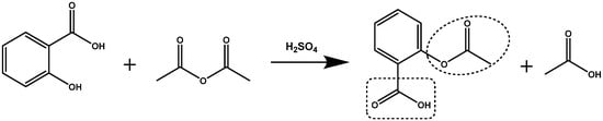 Reaction of salicylic acid with acetic anhydride leading to the synthesis of acetylsalicylic acid and the release of acetic acid. In dotted frames are shown ester bonds.