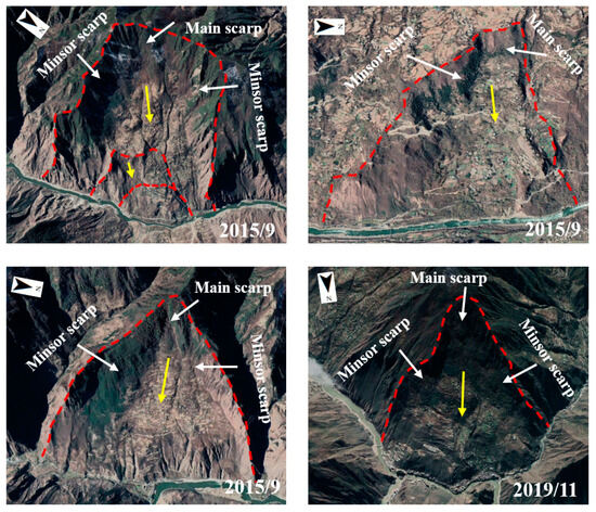 Examples of old landslides. Red lines indicate the old landslide boundary and the yellow arrow indicates the direction of slide.
