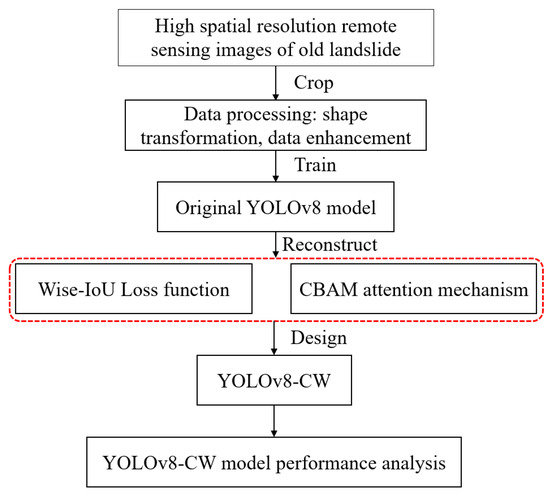 Firstly, high-resolution old landslide image data in the study area are collected based on Google Earth images. These images are subsequently segmented into sizes of 640 × 640, labels are marked, and data enhancement is performed to complete the dataset production. Next, the network structure of the YOLOv8 model is improved by adding a CBAM attention mechanism to the backbone network and modifying the IoU loss function at the detection head to enhance model accuracy. Finally, the finished dataset was trained on the improved model for accuracy assessment. Figure 3 illustrates the old landslide detection process using the improved YOLOv8 algorithm.