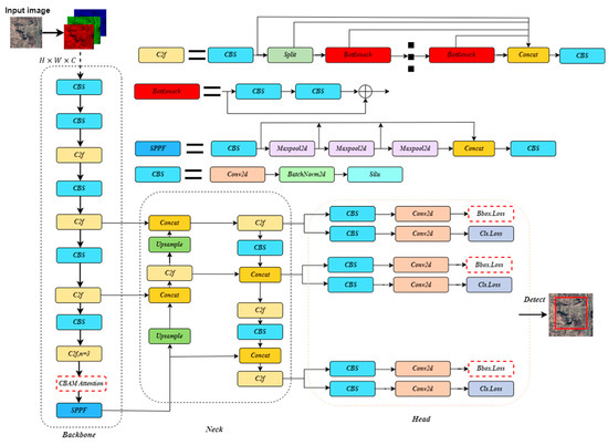 YOLOv8 model. The red dotted box in the backbone network is the location for adding the CBAM attention module and the red dotted box in the head network represent the loss function improved in this paper. Conv2d, BatchNorm2d, Maxpool2d, and Silu denote Two-dimensional Convolution, Batch Normalization for 2D, 2D Max Pooling, and Silu activation function, respectively.