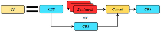 In the backbone network part, YOLOv8 made a significant improvement by replacing the C3 module used in YOLOv5 (Figure 5) with the C2f structure shown in Figure 4. The C2f structure offers a more abundant gradient flow, enhancing the flow of information throughout the network. Additionally, YOLOv8 adjusted the channel numbers differently for different scale models, which further contributed to the overall performance improvement. This enhancement in the backbone network played a crucial role in significantly improving the performance of the YOLOv8 model, leading to better object detection accuracy and more robust feature extraction capabilities [38,39,40].