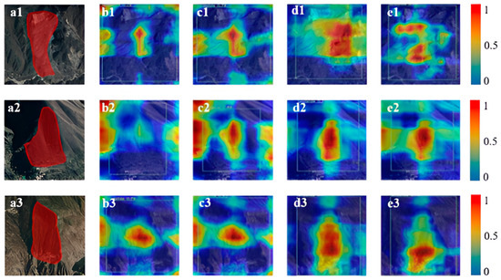 Heat map comparison ((a1–a3) indicates the actual boundary of the old landslide; (b1–b3) represents the YOLOv8; (c1–c3) represents the YOLOv8-SK; (d1–d3) represents the YOLOv8-CBAM; (e1–e3) represents the YOLOv8-SE.).