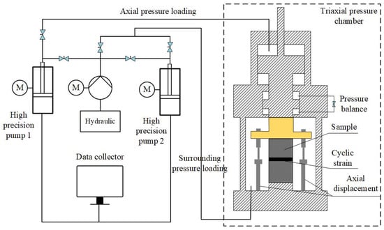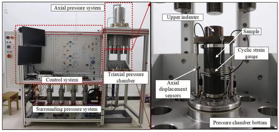 The triaxial rock multi-field coupling test platform was selected for the experiment, as shown in Figure 1. The test platform is mainly composed of a control system, an axial pressure system, a surrounding pressure system and triaxial pressure chamber, and high-precision sensors. The test platform loading system can apply a maximum of 500 MPa of axial stress and 60 MPa of surrounding pressure. The pressure accuracy is ±0.01 MPa. The effect of surrounding pressure is mechanically counteracted by a self-balancing piston head with a triaxial pressure chamber. The axial stress loaded on the sample is directly the stress difference. The triaxial pressure chamber is equipped with high-precision axial displacement transducers and circumferential strain gauges. The displacement sensor has a range of 12 mm and an accuracy of ±0.001 mm. The test platform can be applied to the conventional triaxial mechanical test and external multi-field coupling test of rocks. The principle of the experimental equipment is shown in Figure 2.