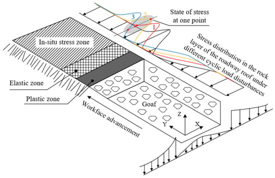 In mining, when the deep surrounding rocks and coal pillars in a high-stress state are affected by the induced stresses generated by mining activities such as the excavation of roadways or chambers and rock support in the neighbouring areas, it will certainly affect the stress state of the surrounding rocks themselves [6]. At the same time, the superposition of the original rock stresses and the induced stresses due to the excavation of the geotechnical mass of the surrounding rock will lead to the disturbance of the total stresses on the surrounding rock, and therefore the total stresses on the surrounding rock in deep underground engineering will always be maintained within a certain range. During excavation, support, or mining, the stress state in the surrounding rock may be cyclically fluctuating [7,8]. Under this cyclic effect of stress, certain cracks and damages are more likely to occur inside the surrounding rock [9,10]. When the induced stress caused by the surrounding rock’s internal cracks reaches a certain level, a series of deep geotechnical engineering disasters such as rock explosions, roof falls, and so on will occur. The surrounding rock of a deeply buried roadway is usually in a high-stress environment, mostly in a state of high stress in three directions. The excavation of the roadway will have an impact on this stress state, and researchers found that through on-site monitoring, the tangential stress of the surrounding rock closer to the roadway edge gang has a tendency to increase and then decrease with the increase in the distance, and the radial stress is the unloading rebound state that decreases and then increases [11,12]. In this case, with the excavation of the adjacent roadway or refuge, the stress influence on the coal pillar between the two roadways easily leads to the occurrence of instability damage. The reason for this is that the coal column subjected to higher rock stress fluctuates in the total stress due to the change in the surrounding stress state, and its internal structure produces a certain stress adjustment, which affects the stability of the coal column between the roadways in the adjustment of internal stress under higher ground stress conditions [13]. Sandstone is a common rock in underground engineering, and the roof slabs of some coal mines are mostly sandstone. The sandstone with high strength tends to gather large energy internally under the action of a cyclic load of mining and excavation, and the sudden release of energy in a short period of time will produce a large threat to people and property. Therefore, it is of great significance to research the mechanical properties, internal energy evolution characteristics, and damage destruction laws of high-strength sandstone under cyclic loading to maintain the stability of the surrounding rock in deep mining roadway and ensure the safe operation of deep geotechnical engineering.