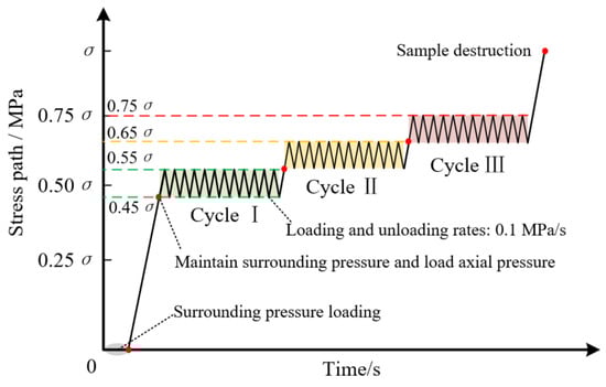 In the vicinity of the work face, stress-raising and stress-reducing zones are formed within a certain range. As the work face advances and the hydraulic support of the roadway top plate is “supporting and shifting”, the rock layer of the roadway top plate will be subjected to the cyclic alternating action of “loading and unloading”. The interior of the top rock layer at a point then exhibits repeated changes in stress in the vertical direction. In order to analyse the change pattern of the mechanical properties of the top rock layer at this point of the process, high-strength sandstone samples were investigated using triaxial graded cyclic loading and unloading. In order to investigate the mechanical and energetic characteristics of sandstone after thorough disturbance, the number of loading cycles per stage is 12. According to the experimental purpose and experimental equipment specifications in the triaxial multistage cyclic loading and unloading test, the stress-controlled loading method is adopted, in which the surrounding pressure is first loaded to a predetermined value and then the axial load is applied. The surrounding pressures were 0 MPa, 5 MPa, 10 MPa, 15 MPa, and 20 MPa with a loading rate of 0.1 MPa/s. The axial cyclic loading is divided into three stages of 0.45σ to 0.55σ, 0.55σ to 0.65σ, and 0.65σ to 0.75σ, where σ is the average of the peak stresses of the samples obtained from the conventional triaxial compression test at the corresponding surrounding pressure. The axial cyclic loading and unloading rates were both 0.1 MPa/s. After completing the corresponding cycle, loading and unloading continue to load at a rate of 0.1 MPa/s until the sample is destroyed, and the stress loading path is shown in Figure 4. In order to obtain the peak strength of the sample at different surrounding pressures, a conventional triaxial compression test at the corresponding surrounding pressure should also be carried out. After the sample reaches the peak strength, the residual strength of the sample is obtained by displacement loading in a controlled manner at a rate of 0.02 mm/min. The details of the experimental programme are shown in Table 1.