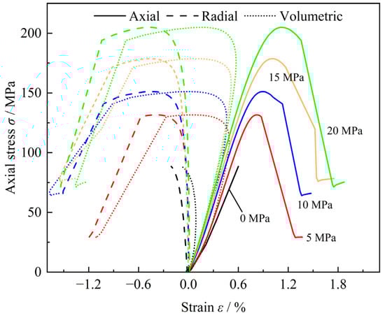 According to the experimental results, it can be seen that the difference between the peak values of the stress–strain curves obtained from the three samples under the same stress condition is small, which is less than 6%. High-strength sandstone samples are more homogeneous and less discrete. In order to simplify the analysis while ensuring scientific and reasonable experimental conclusions, one sample was selected from each group of three samples to be analysed. The conventional triaxial compressive stress–strain curves of the samples under different surrounding pressures are shown in Figure 5.