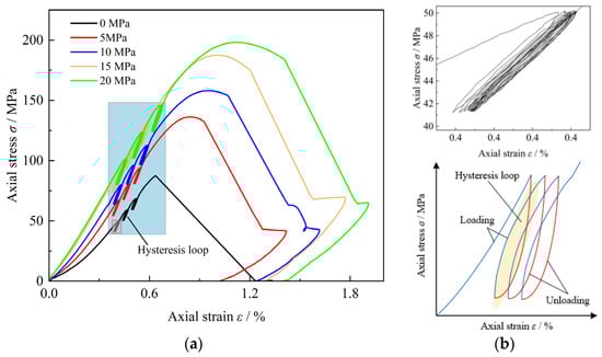 The stress–strain curves of triaxial cyclic loading and unloading under different surrounding pressures are shown in Figure 6. A significant hysteresis effect was observed in the stress–strain curve of the rock samples during cyclic loading experiments, forming a closed stress–strain hysteresis loop between the unloading curve and the loading curve of the next cycle [24,25]. Defects such as microfractures, pores, and joints contained within natural rock cause non-ideal elasticity in rock deformation. When unloading after loading to a certain stress level, the unloading curve does not match the original loading curve and is lower than the original loading curve. The unloading curve forms a closed annular region with the loading curve of the next cycle. The presence of hysteresis loops in the stress–strain curve also represents energy dissipation. The area of the hysteresis loop can represent the amount of energy dissipated in the loaded rock sample as a result of crack closure, expansion, connection penetration, and destruction (dissipation energy). The larger the area of the hysteresis loop, the more energy is dissipated and the greater the damage to the rock sample.