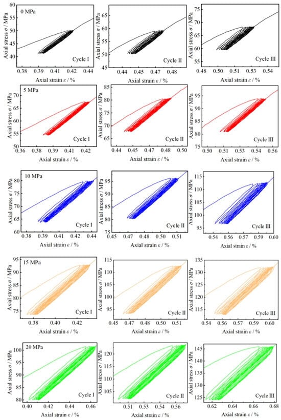 The hysteresis loop curves for different cyclic loading stages at various surrounding pressures are shown in Figure 7. Under cyclic loading, there is a stiffness degradation in high-strength sandstone samples where the peak point displacement per cycle increases with the number of cycles. The stiffness degradation is progressively more pronounced with the increase in the surrounding pressure. The hysteresis loops are more dispersed in the first 3–4 cycles and the distribution of hysteresis loops generated by the rest of the loading cycles is more concentrated, with some hysteresis effect of hysteresis loops. From the variation in the hysteresis loop area of sandstone samples under the same surrounding pressure, it can be seen that the energy dissipation in the same level of cyclic loading decreases slightly with the increase in the number of cycles. This indicates that the first stage of cyclic loading caused some damage to the sandstone samples and micro cracks formed in the samples. The later stages of cyclic loading caused the samples to consume less energy to produce the same strain. Sandstone samples are subjected to strain accumulation under cyclic loading, as evidenced by the stress–strain curve where the end point of a single cycle is higher than the start point. The cyclic loading creates a permanent deformation of the samples. This strain accumulation increases with the number of cyclic loads applied.
