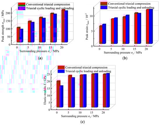 Effect of conventional triaxial compression and triaxial cyclic loading on strength parameters of samples at different surrounding pressures. (a) Peak strength; (b) peak strain; (c) modulus of elasticity.