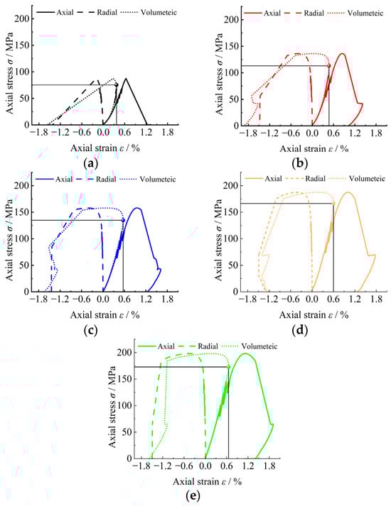 Strain curves of sandstone samples under triaxial cyclic loading and unloading with different surrounding pressures. (a) 0 MPa; (b) 5 MPa; (c) 10 MPa; (d) 15 MPa; (e) 20 MPa.