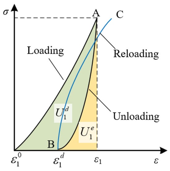 In general, the energy evolution of loaded samples goes through the processes of energy input, accumulation, dissipation, and release. Considering the reversibility of the elastic energy and the irreversibility of the dissipation energy, only the axial elastic energy and dissipation energy are systematically investigated. The elastic and dissipation energies of the samples were calculated using triaxial cyclic loading and unloading test stress–strain curves. The calculation of the energy density of the sample in cyclic loading and unloading at a certain stress level is shown in Figure 10. The elastic energy density and dissipation energy density are shown in Equation (9).