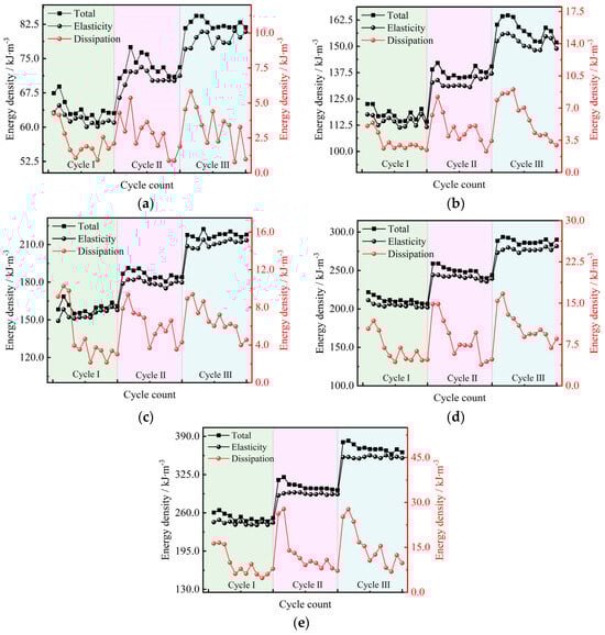 The cyclic loading count–energy density curve of the sample. (a) 0 MPa; (b) 5 MPa; (c) 10 MPa; (d) 15 MPa; (e) 20 MPa.