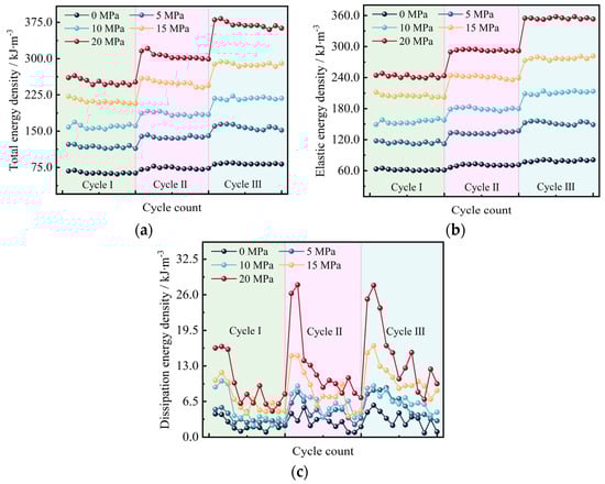 Total energy density, elastic energy density, and dissipation energy density curves of cyclic loading and unloading samples under different surrounding pressures. (a) Total energy density; (b) elastic energy density; (c) dissipative energy density.