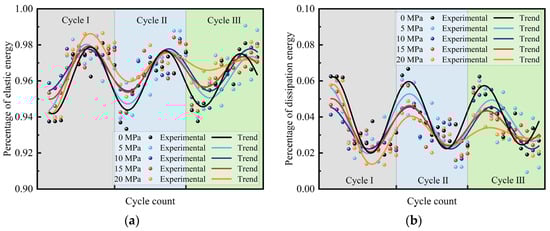 Energy percentage of samples under triaxial cyclic loading. (a) Percentage of elastic energy; (b) percentage of dissipated energy.