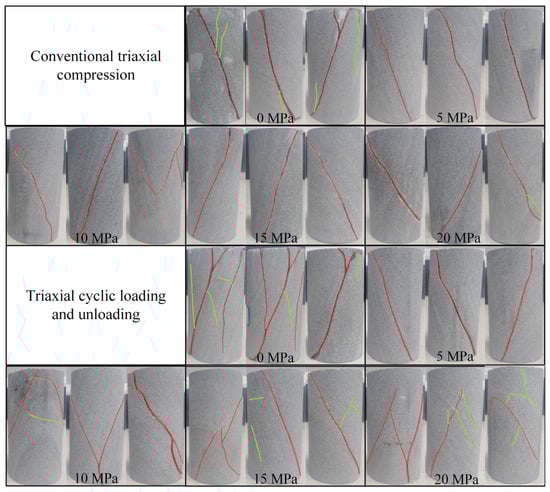 The macroscopic damage characteristics of rock depend on the distribution of micro cracks and the expression of detailed mechanical properties [26]. The main forms of macroscopic damage in loaded rock are shear damage, tensile damage, compression damage, and laminar spalling. The macroscopic crack morphology and crack distribution of hard sandstone samples after conventional triaxial compression and triaxial cyclic loading experiments can be observed to obtain their macroscopic damage characteristics and patterns. The damage characteristics of the loaded sandstone samples are shown in Figure 14. The red part indicates the main macroscopic cracks that lead to the strength loss and destabilisation of the sample, while the green part indicates the micro cracks or tension cracks due to the loading of the rock.