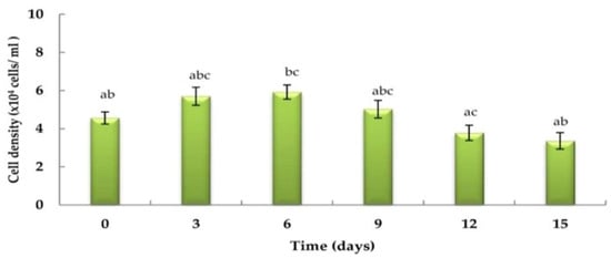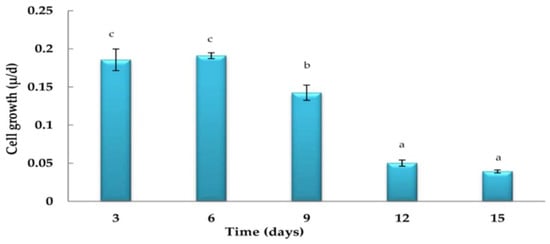 Growth curve of Haematococcus pluvialis under an artificial photon flux density of 25 μmol m−2 s−1 (n = 5). Data are represented as mean ± SD (error bars). Bars with different letters indicate significant differences in the growth rates among culture days at p-values < 0.001.