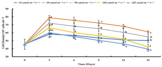 Comparison of H. pluvialis growth curves under nitrogen depletion and varying light intensity conditions (n = 5). Data are represented as mean ± SD (error bars). Bars with different letters indicate significant differences in the cell density among culture days at p-values < 0.001.