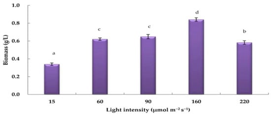 Comparison of H. pluvialis biomass after 15 days of culture under nitrogen-depleted conditions at different light intensity levels (n = 5). Data are represented as mean ± SD (error bars). Bars with different letters indicate significant differences at p < 0.001.
