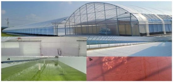 The developed hybrid culture system was connected to two culture tanks. The first was a square tank for the growth of the green stage of H. pluvialis, which consisted of a greenhouse covering, a temperature control system, and a filtered air supply. The second tank was a system designed in our laboratory, consisting of a greenhouse composed of sunlight-controlled material and an air agitation system for the astaxanthin accumulation stage. A schematic diagram of this culture system is shown in Figure 1.