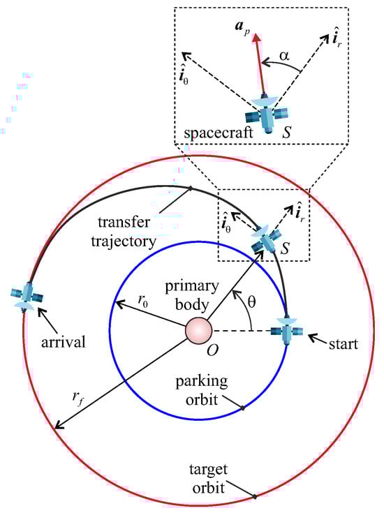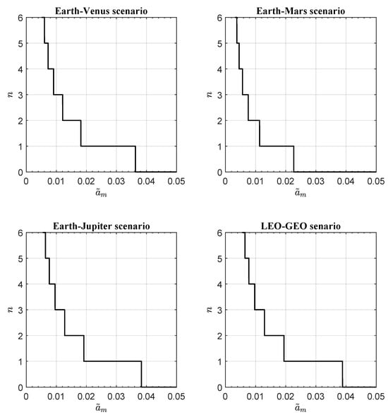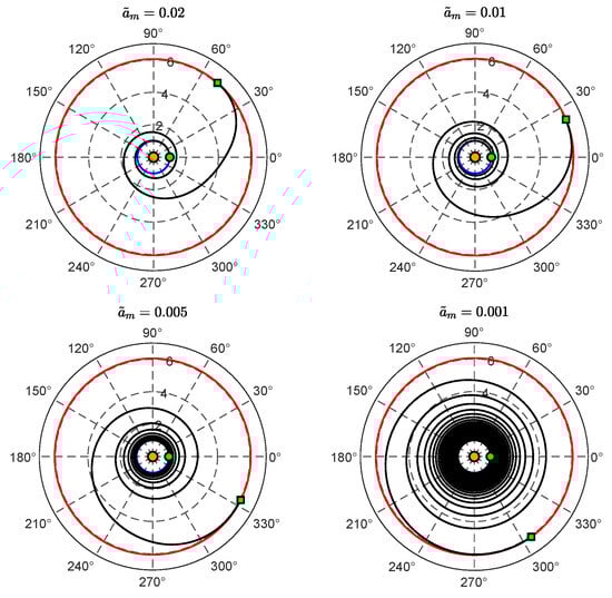 In particular, regarding a potential heliocentric mission scenario, the initial parking orbit radius was set equal to . In fact, the case of models the situation in which the spacecraft begins the heliocentric phase of a typical interplanetary transfer after escaping from Earth using a parabolic (escape) orbit. In this context, three different (circular) target obits were considered; that is, three different values of were used in the numerical simulations, namely (i) , which models an Earth–Venus transfer; (ii) , which models an Earth–Mars transfer; and (iii) , which models an Earth–Jupiter transfer. Accordingly, in this selected set of heliocentric mission scenarios, the dimensionless value of the target orbit radius is . As regards the geocentric mission scenario, a classical (two-dimensional) LEO-GEO transfer is considered, in which the radius of the circular parking orbit is (i.e., a circular LEO of of altitude is assumed) and the target orbit has a radius . Therefore, in the geocentric case, the dimensionless value of the target orbit radius is .