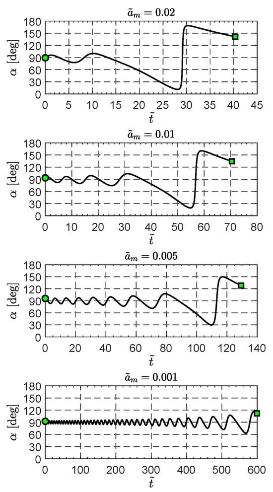 Figure 5, while the (dimensionless) time variation in the thrust angle