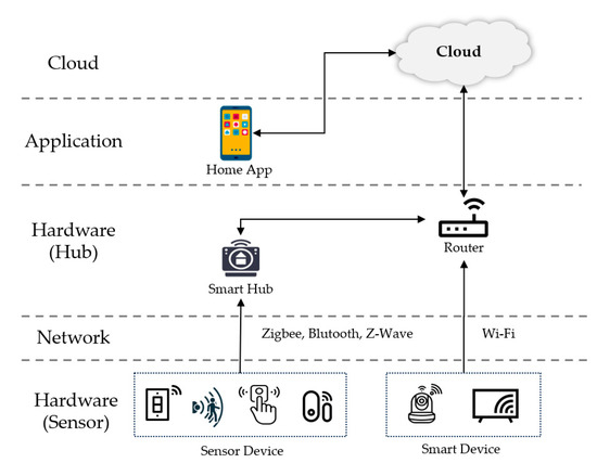 The diagram culminates at the smart hub, operating as the central node facilitating communication between physical devices and the user-interface application. Furthermore, the hub extends into the cloud to enhance data processing and storage capabilities. This layered architecture mirrors the operational dynamics of IoT systems, underscoring the potential forensic challenges that arise due to the decentralized and diverse nature of IoT environments. These challenges are explored in the subsequent sections of this research. Consequently, the schematic in Figure 1 is crucial for comprehending the interconnected IoT landscape and the ensuing digital forensic hurdles within smart-home networks.