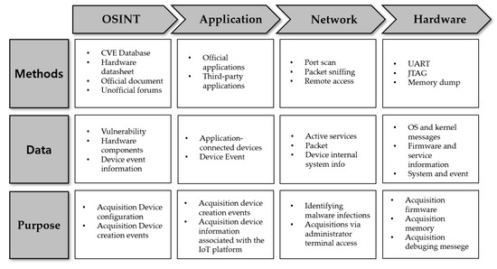 This section proposes a comprehensive methodology for investigating hacking incidents in smart-home platforms, encompassing four main aspects: open-source intelligence (OSINT), network, application, and hardware. This classification reflects the complexity and diversity of smart-home environments and considers the characteristics of heterogeneous IoT devices to enable holistic data collection and analysis. The methodology proposed in Figure 2 builds on existing forensic approaches in IoT, as discussed by Hutchinson et al. [33]. The key distinction of the proposed methodology is its focus on consistent data acquisition from an incident investigation perspective in already implemented smart-home environments.
