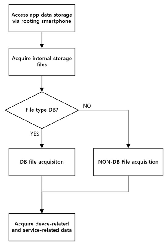 One of the critical advantages of this internal storage access approach is that it does not require additional account information or separate access permissions. Unlike typical API calls, rooting allows direct access to the application’s internal storage, which is very useful in hacking incident investigations. This internal storage contains various data (e.g., DB files and XML files), including account information used in the app and the device log information, which are crucial for hacking incident investigations. The investigation from the perspective of the application involves collecting the following information: