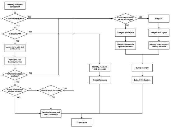 The process of hardware-based data collection and analysis is crucial for understanding the operational mechanics and security posture of IoT devices, as well as identifying potential security vulnerabilities. This process involves collecting a wide range of information, such as operating system (OS) and kernel messages, firmware details, service information, system and event logs, and operational data. From a forensic perspective, these data are essential for dissecting and understanding the intricacies of IoT environments, especially in the context of security incidents. When a device is in an inactive state or fails to acquire meaningful data from previous processes, an investigation can be conducted from a hardware perspective. Further, IoT devices often have debugging interfaces for management and control purposes. Users can read messages or access the management terminal using appropriate tools for each interface. Furthermore, information can be obtained by removing components, such as the flash memory, from the device and reading the memory. The objectives of conducting a hardware-level investigation include the following:
