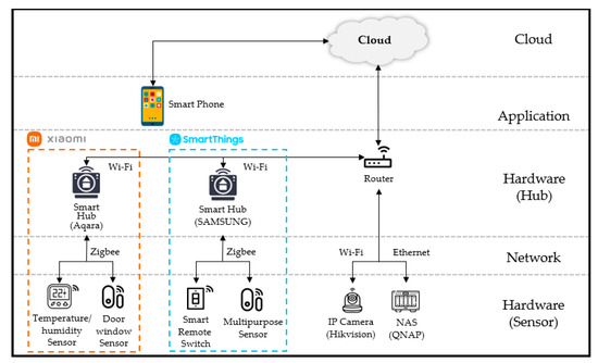 This section describes the experimental setup designed to collect data from four aspects of a smart-home environment, as illustrated in Figure 7. The smart-home testbed used Samsung SmartThings and Aqara platforms, incorporating the following devices: a smart-home hub, smart cameras, smart sensors and storage, and an IP camera.