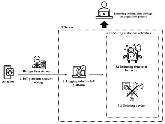 This scenario assumes a situation in which an external attacker has infiltrated an IoT environment and taken control of the system by means other than malware. Because of their limited resources, IoT devices have relatively fewer means to defend against external attacks compared with other network devices. Considering this, collecting artifacts of attacks initiated by an intruder in IoT devices is a critical task.